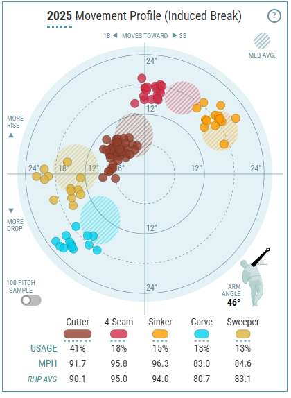 One thing that Strowd brings is a deep arsenal of pitches. He utilizes a four-seamer, sinker, cutter, sweeper, and curveball. Here’s a look at his pitch plot on Baseball Savant.